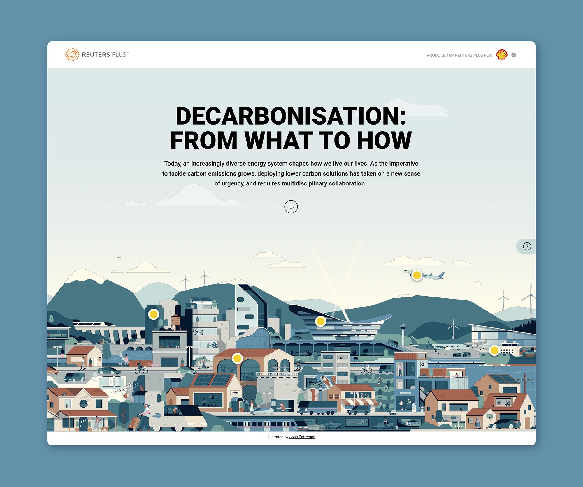 Commissioned by Reuters, I was asked to produce a series of illustrations to promote Shell’s latest ventures into renewable energy and low carbon solutions.